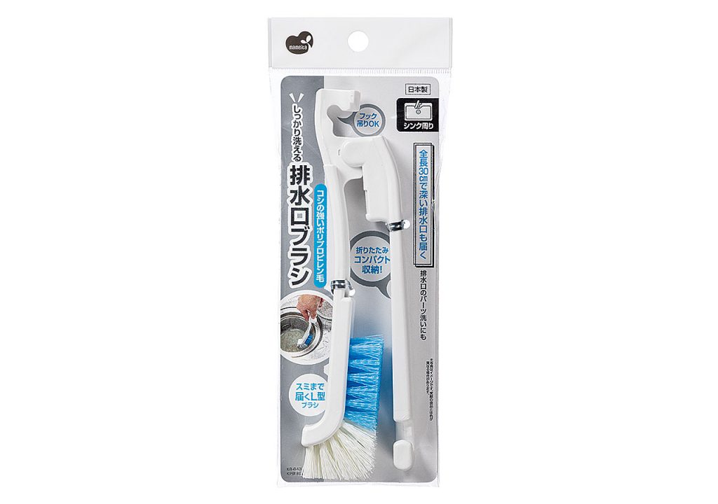 コシの強い毛で汚れを落とす。 深い排水口も届きます。 ハンドルがたためます。